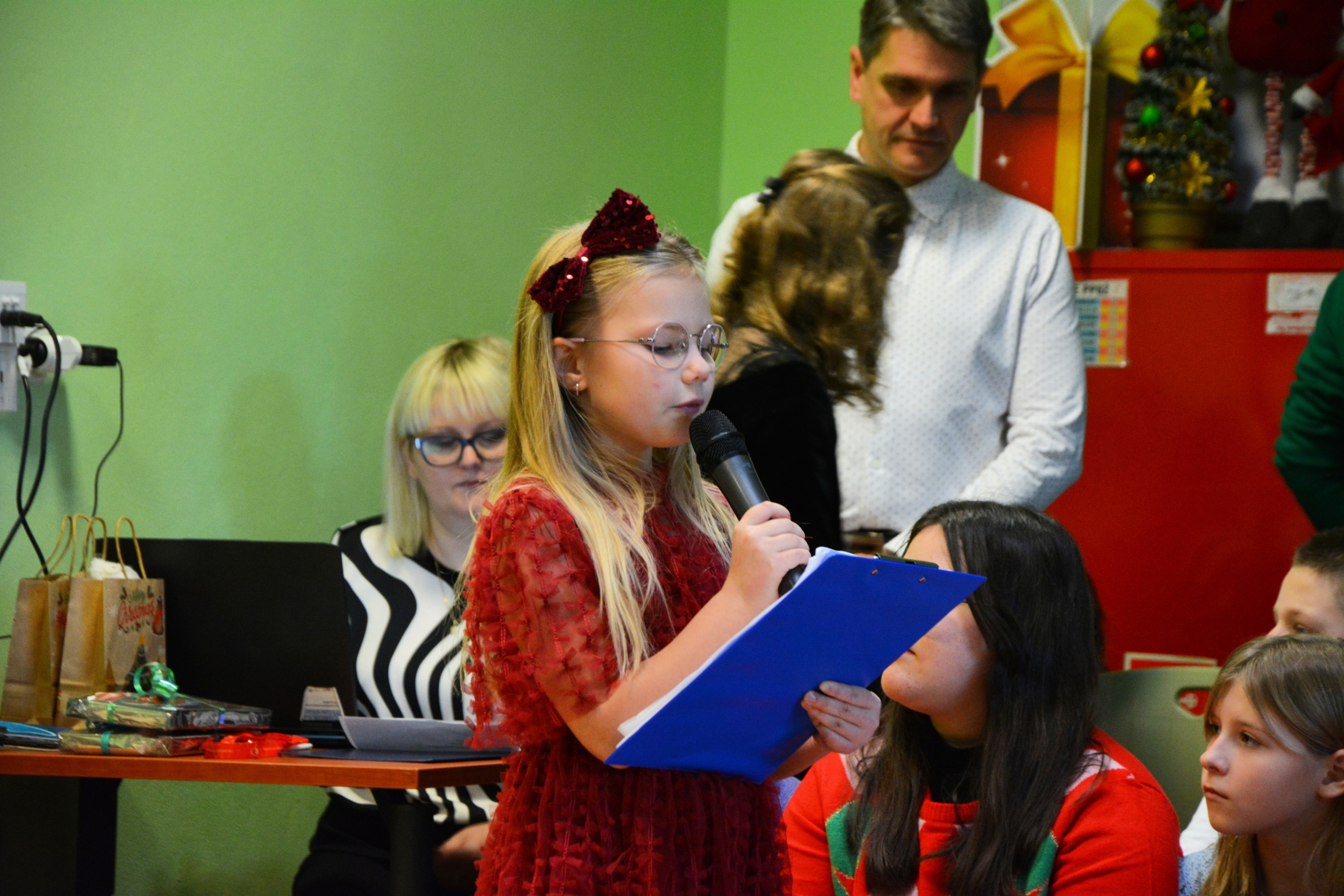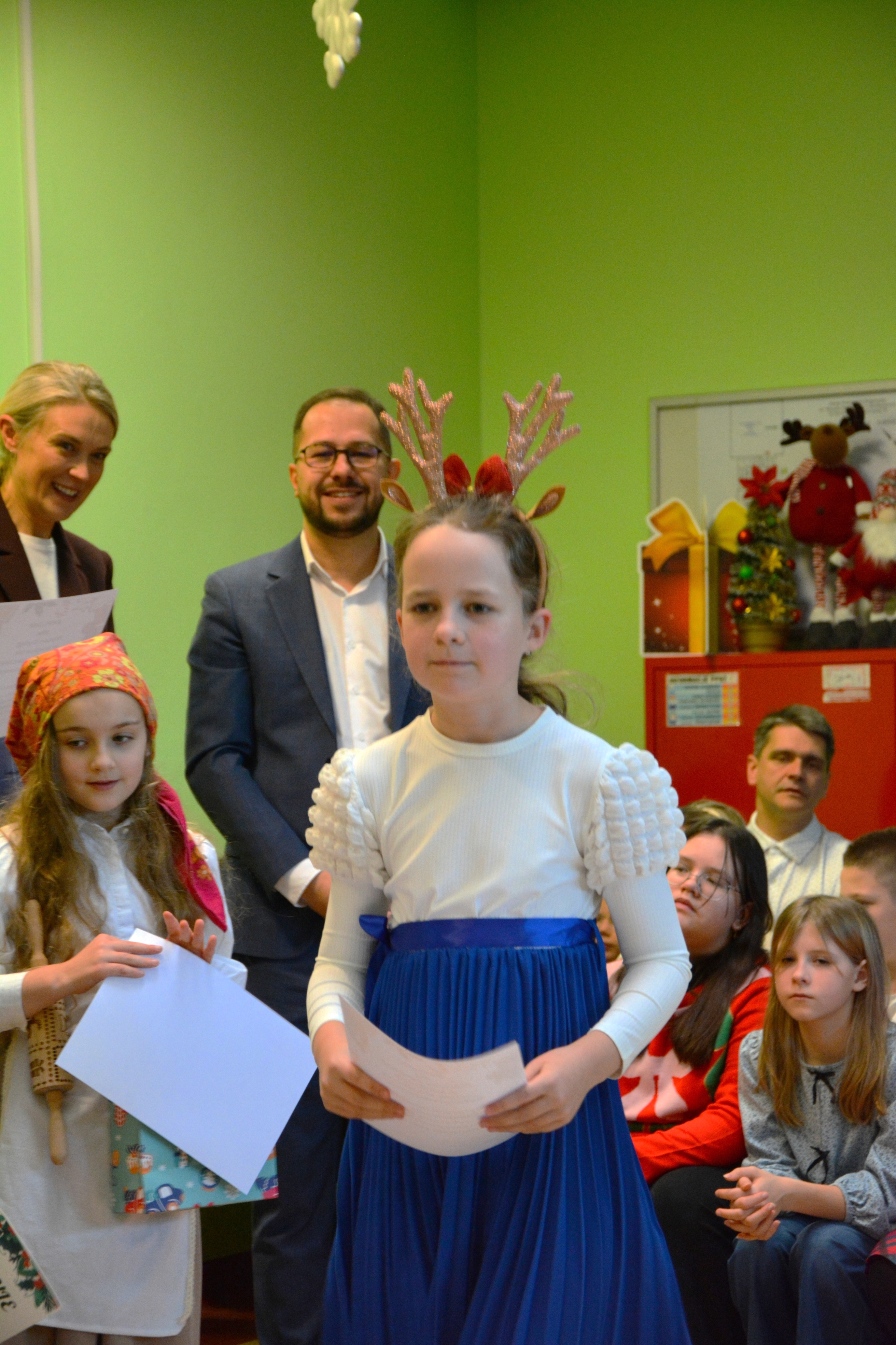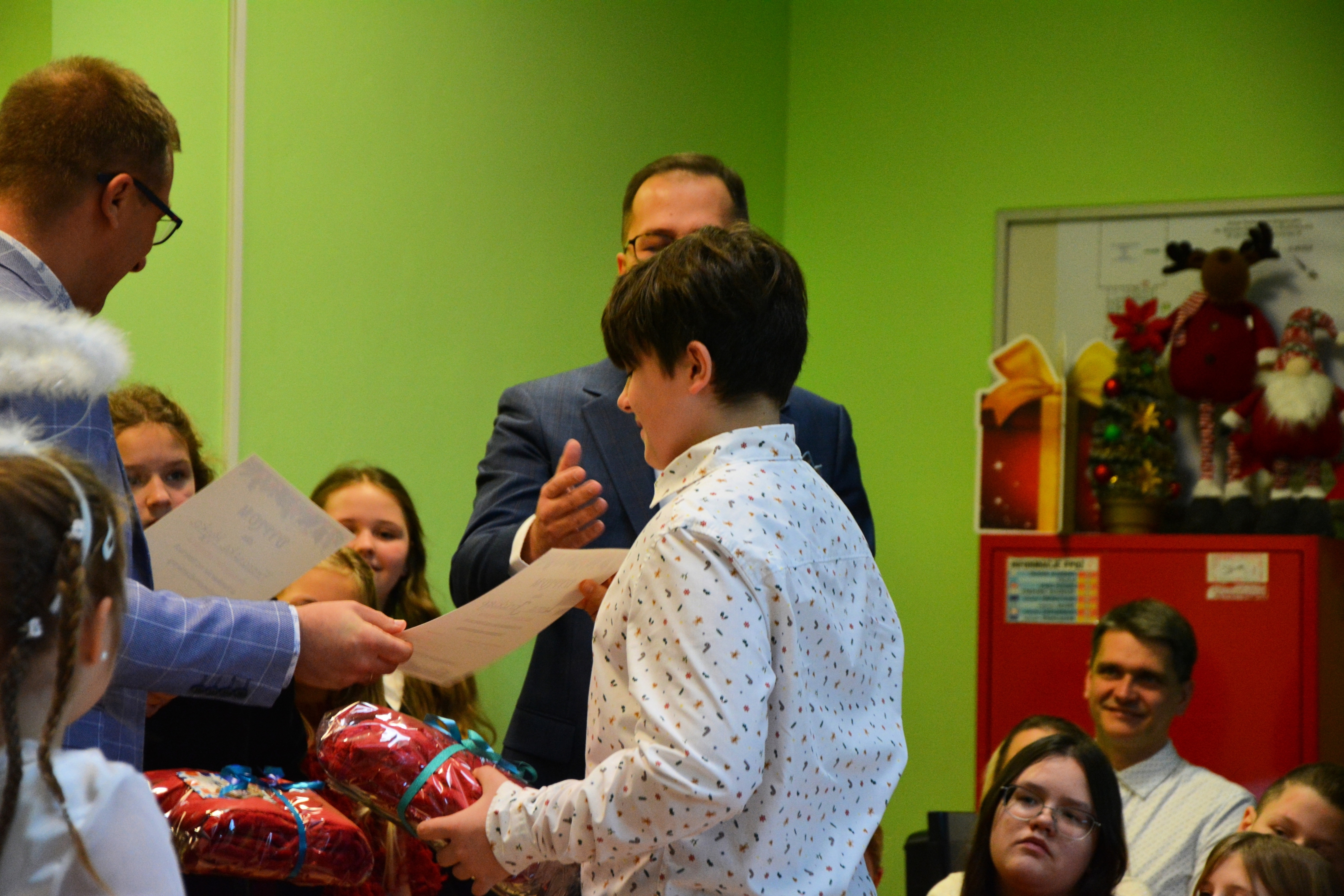 Następnie rozstrzygnięto konkurs na najpiękniejszy łańcuch choinkowy, zorganizowany przez panią Agnieszkę Samek i pana Daniela Cyrybulkę. Konkursowe łańcuchy można podziwiać na parterze budynku A.