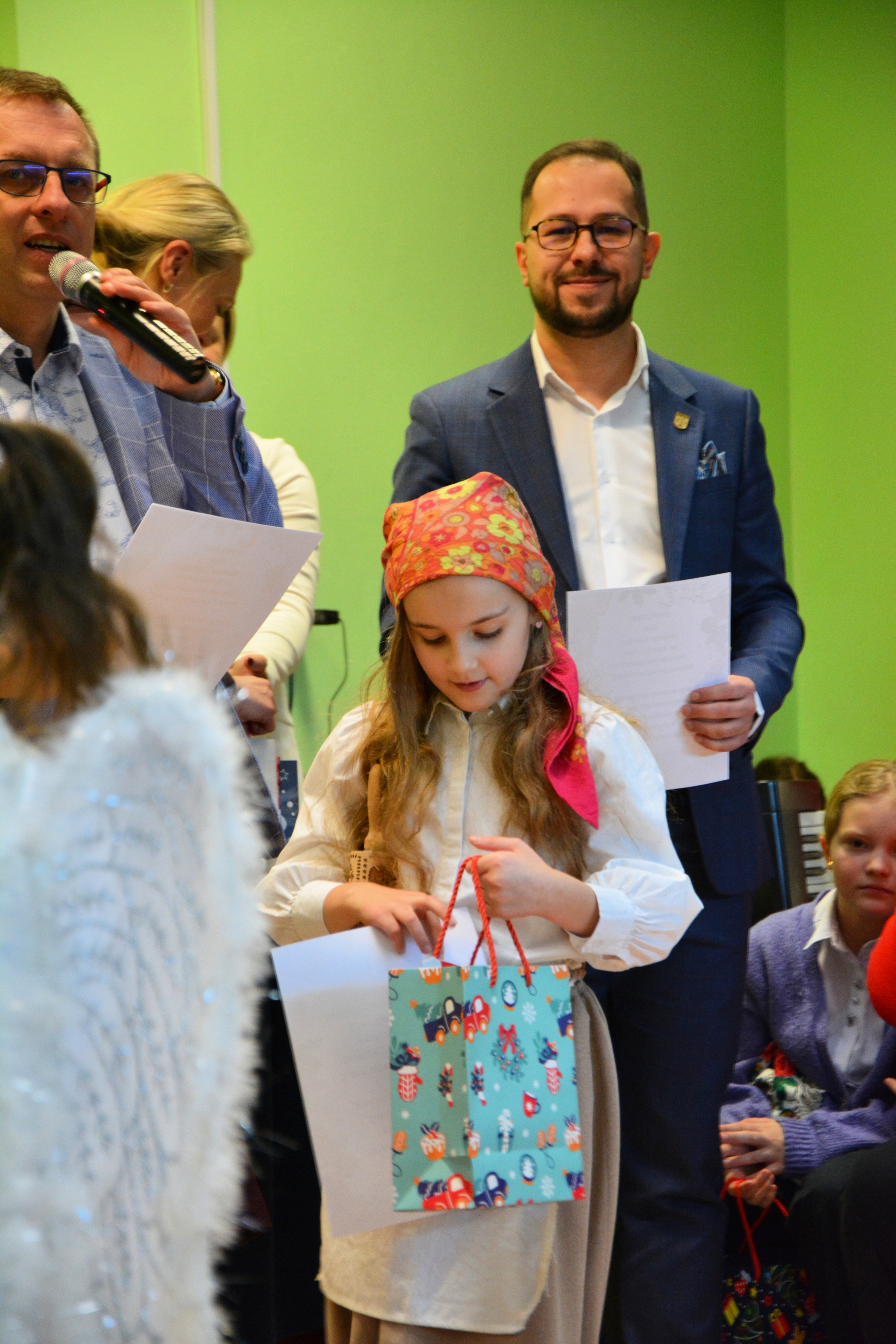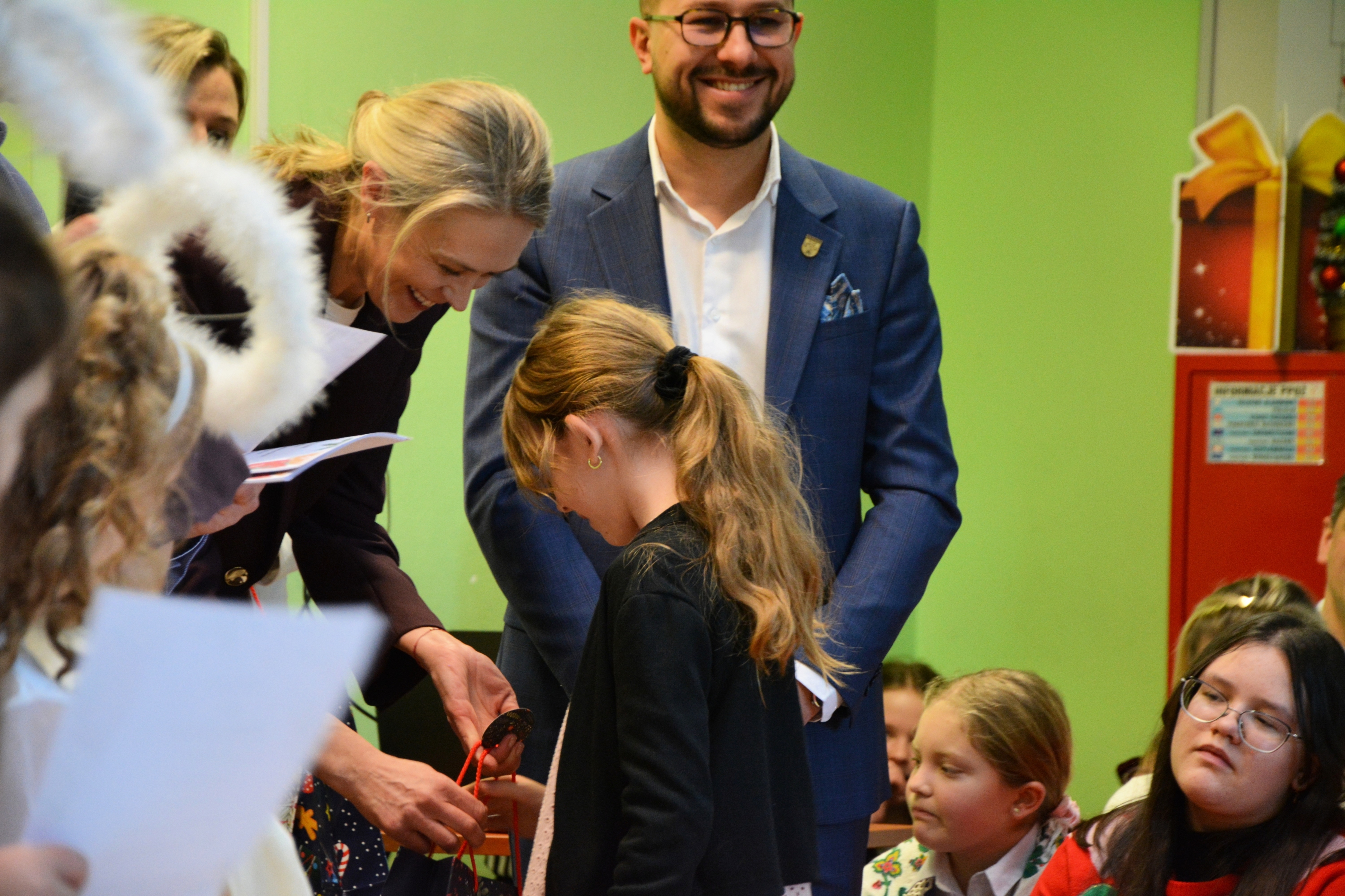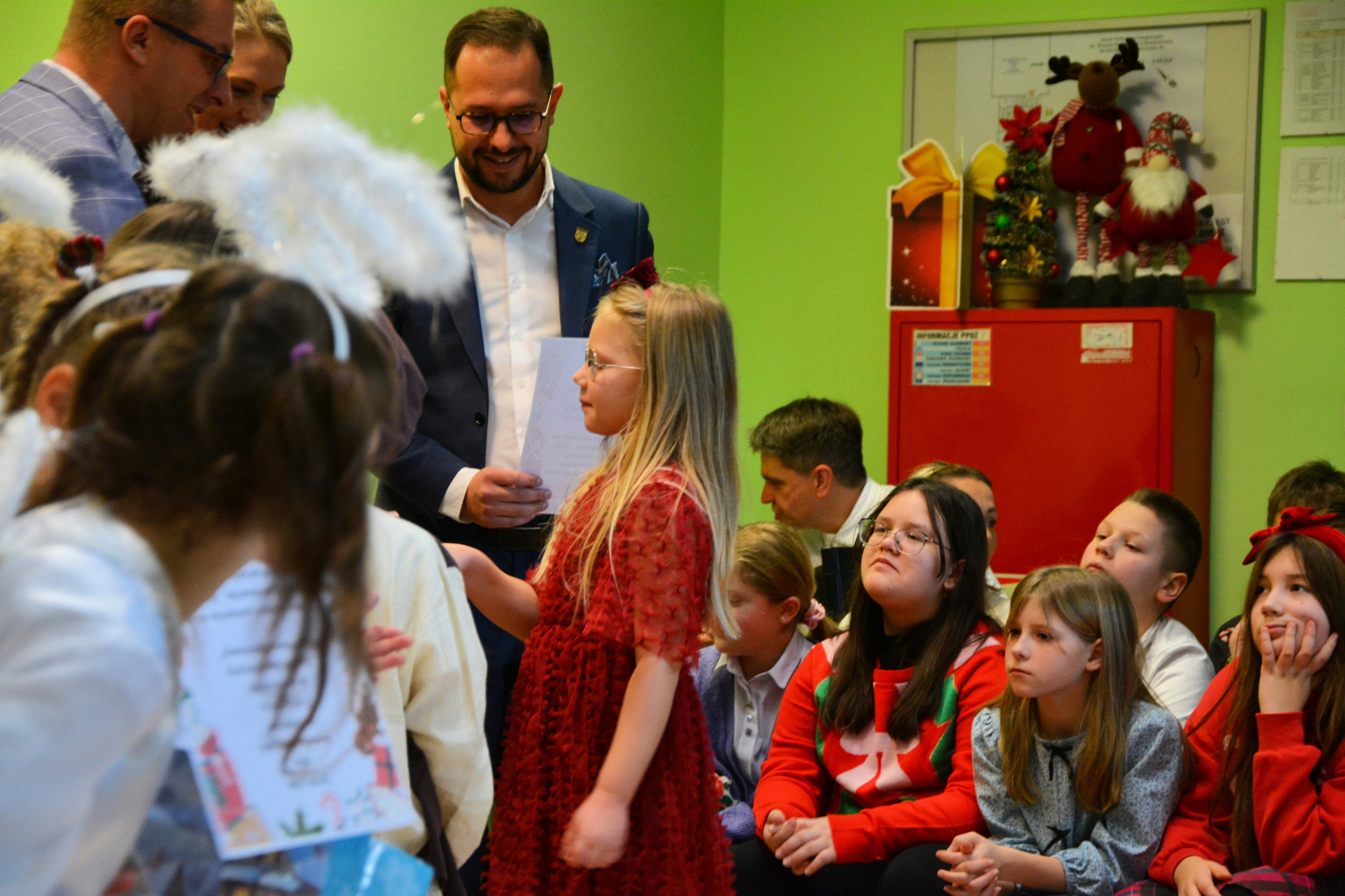 Następnie rozstrzygnięto konkurs na najpiękniejszy łańcuch choinkowy, zorganizowany przez panią Agnieszkę Samek i pana Daniela Cyrybulkę. Konkursowe łańcuchy można podziwiać na parterze budynku A.