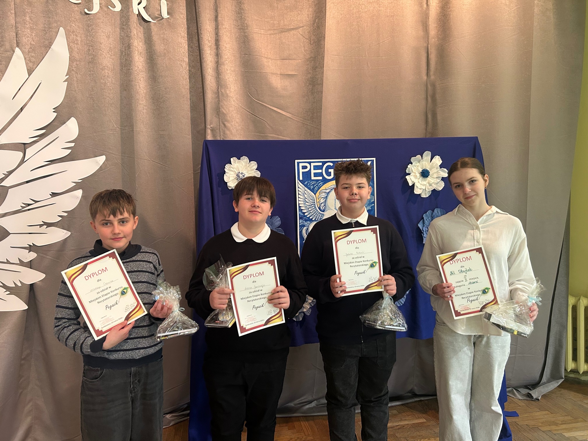 11 marca uczniowie naszej szkoły wzięli udział w miejskim etapie konkursu recytatorskiego „Pegazik”. Szkołę reprezentowali: Jakub Buturla, Mikołaj Czarnik oraz Leon Janicki w kategorii młodszej, a także Nel Obajtek w kategorii starszej