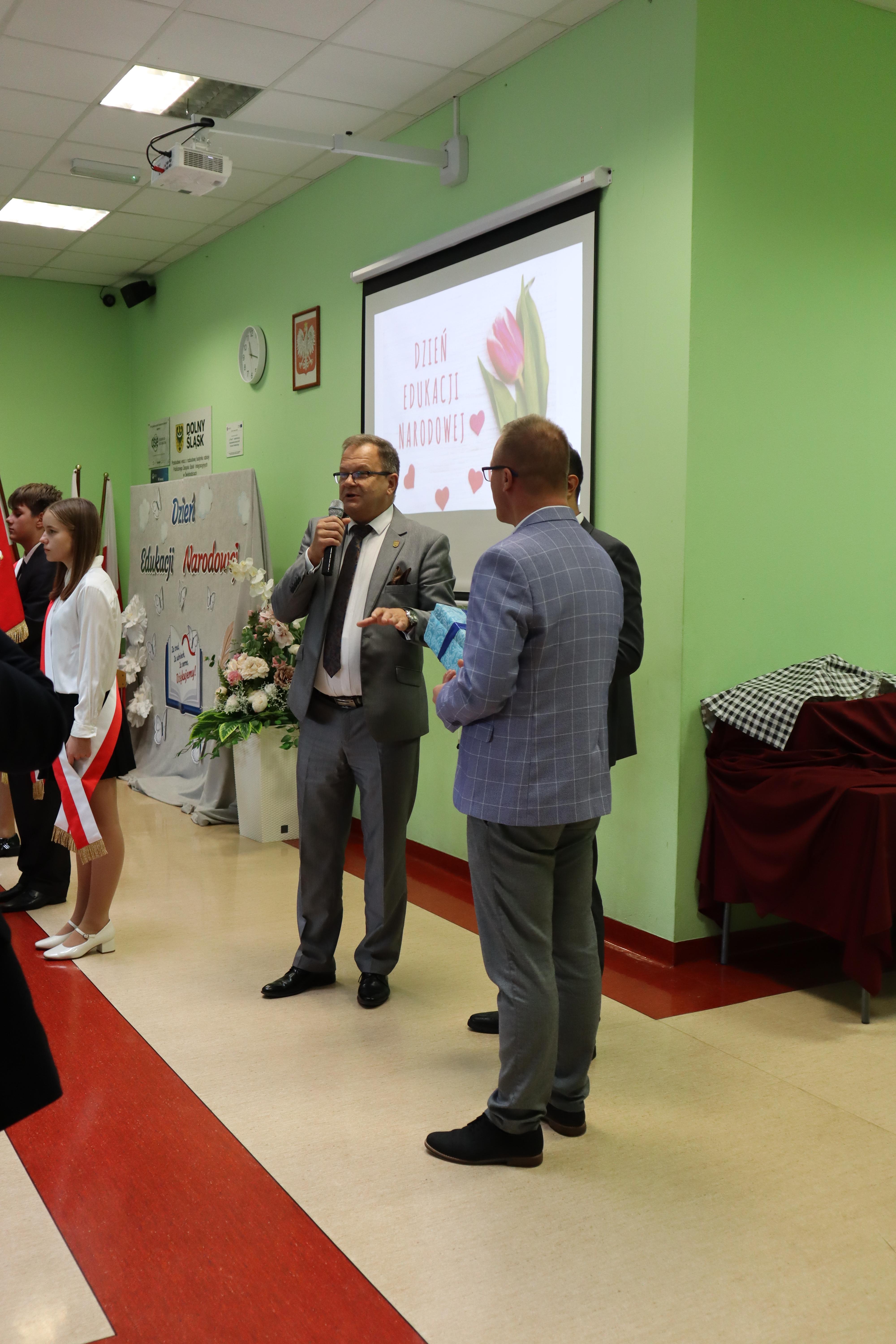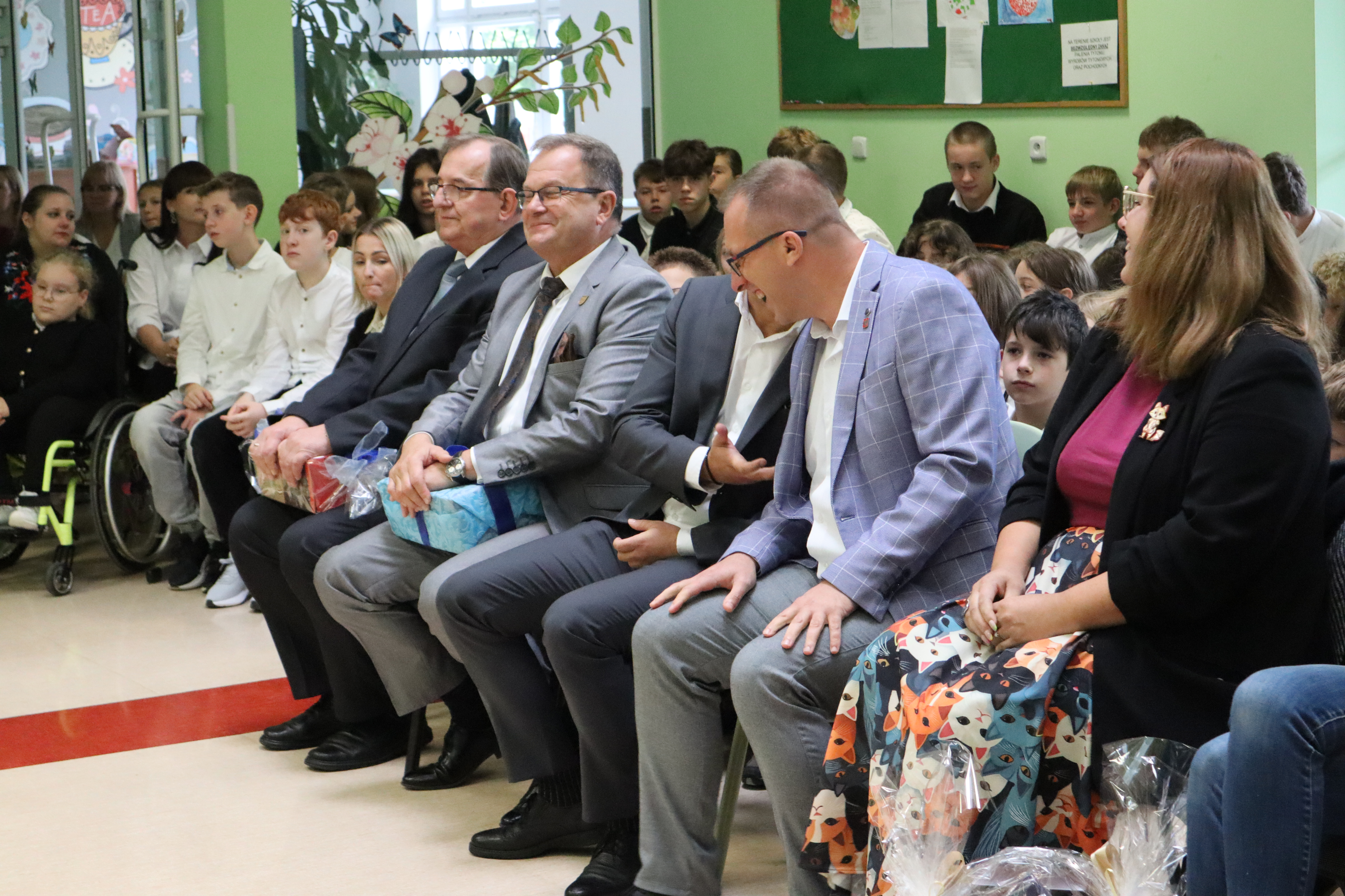 Dzień Edukacji Narodowej to tak naprawdę święto wszystkich osób zaangażowanych w pracę i codzienne życie szkoły. Goście zostawili również dla uczniów i nauczycieli słodkie upominki, przekazane do rąk dyrektora.
