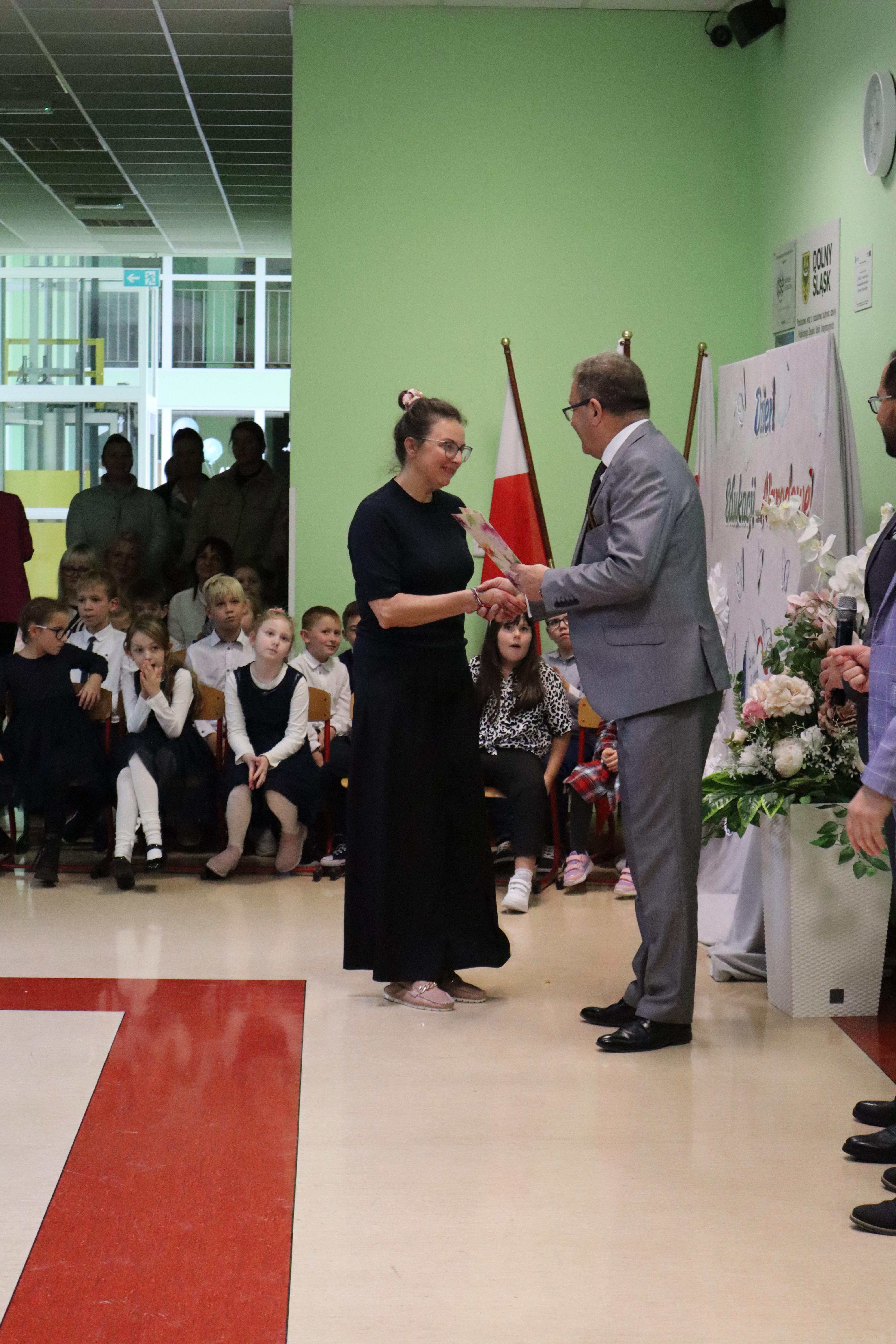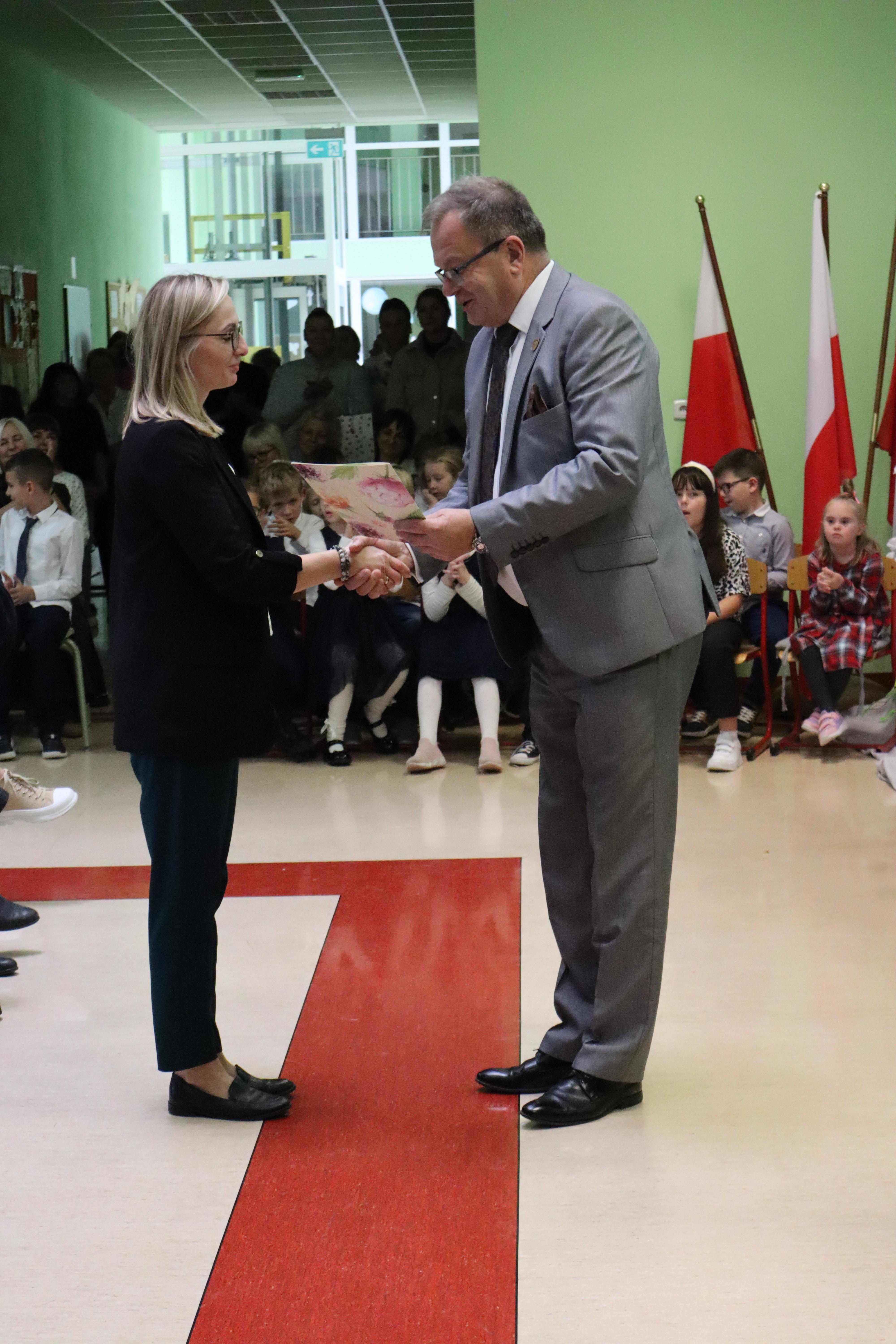 Pan Łukasz Kucemba wraz z Burmistrzem oraz Zastępcą Burmistrza, wręczyli nauczycielom i pracownikom placówki podziękowania i gratyfikacje.