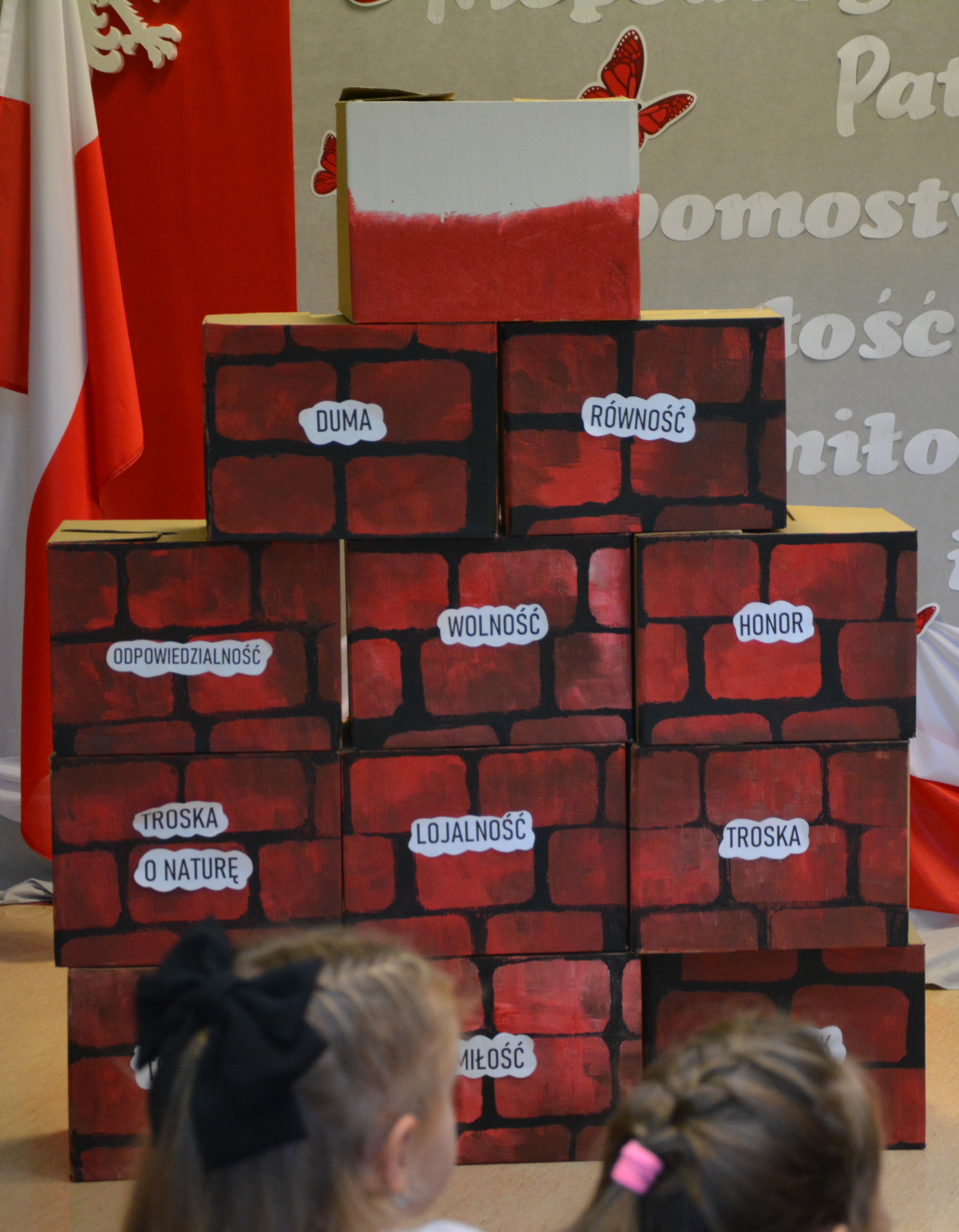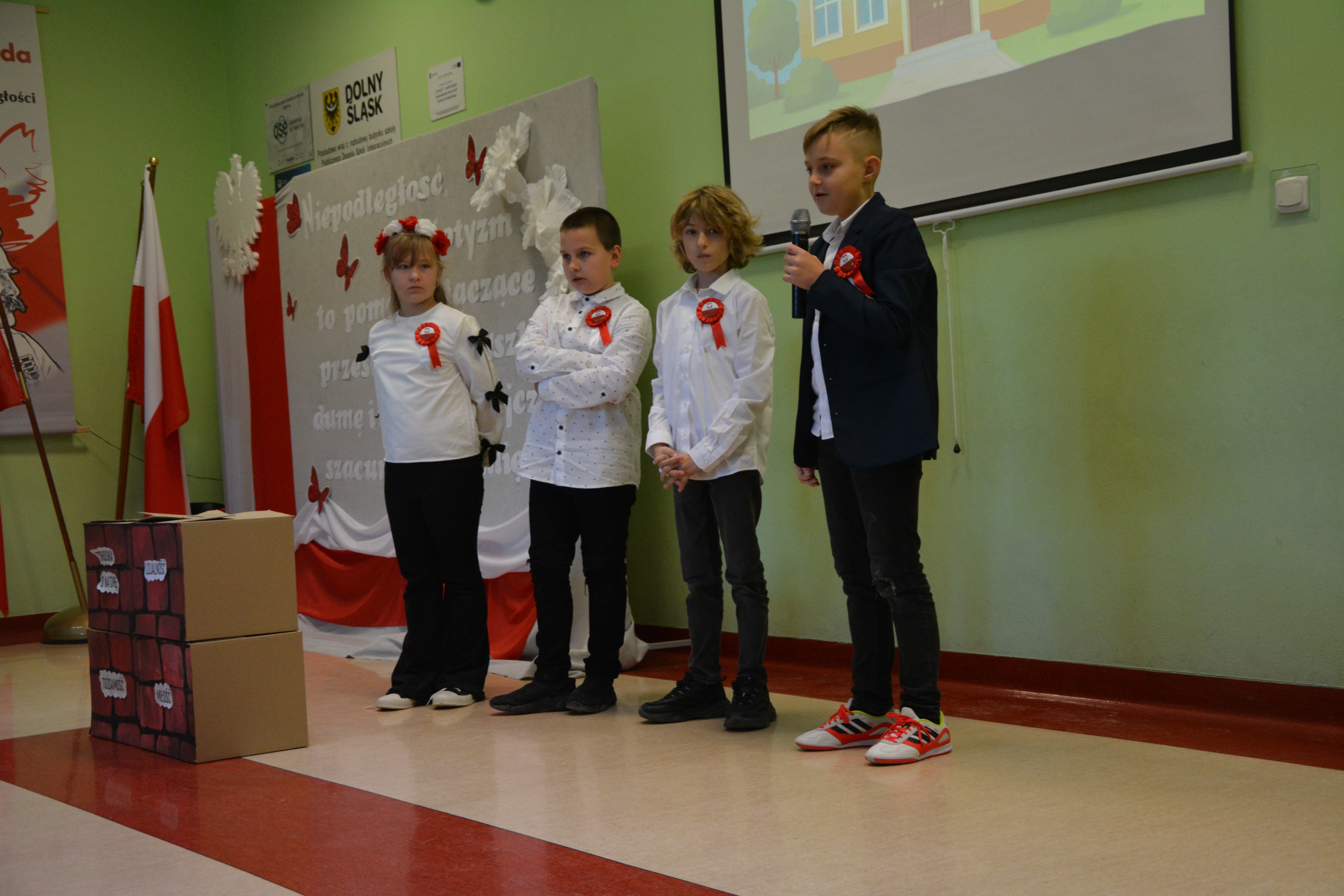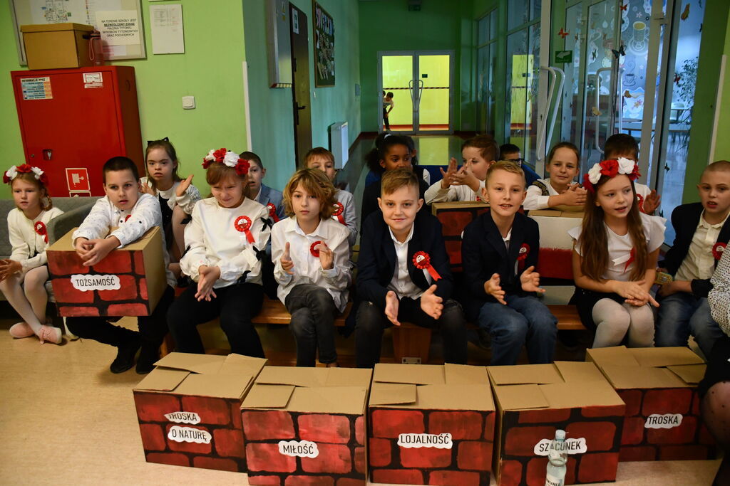 W części artystycznej, która przybrała formę teatralno- wokalno- happeningową, uczniowie klasy trzeciej omówili po krótce najważniejsze daty związane z dążeniem Polaków do odzyskania niepodległości, a następnie opowiedzieli w formie happeningu o jedenastu wartościach, które powinien w sercu nosić każdy Polak. Postawili symboliczny mur, którego powinniśmy bronić każdego dnia. Nie zabrakło wzruszenia przy występach wokalnych uczennic z klasy trzeciej.