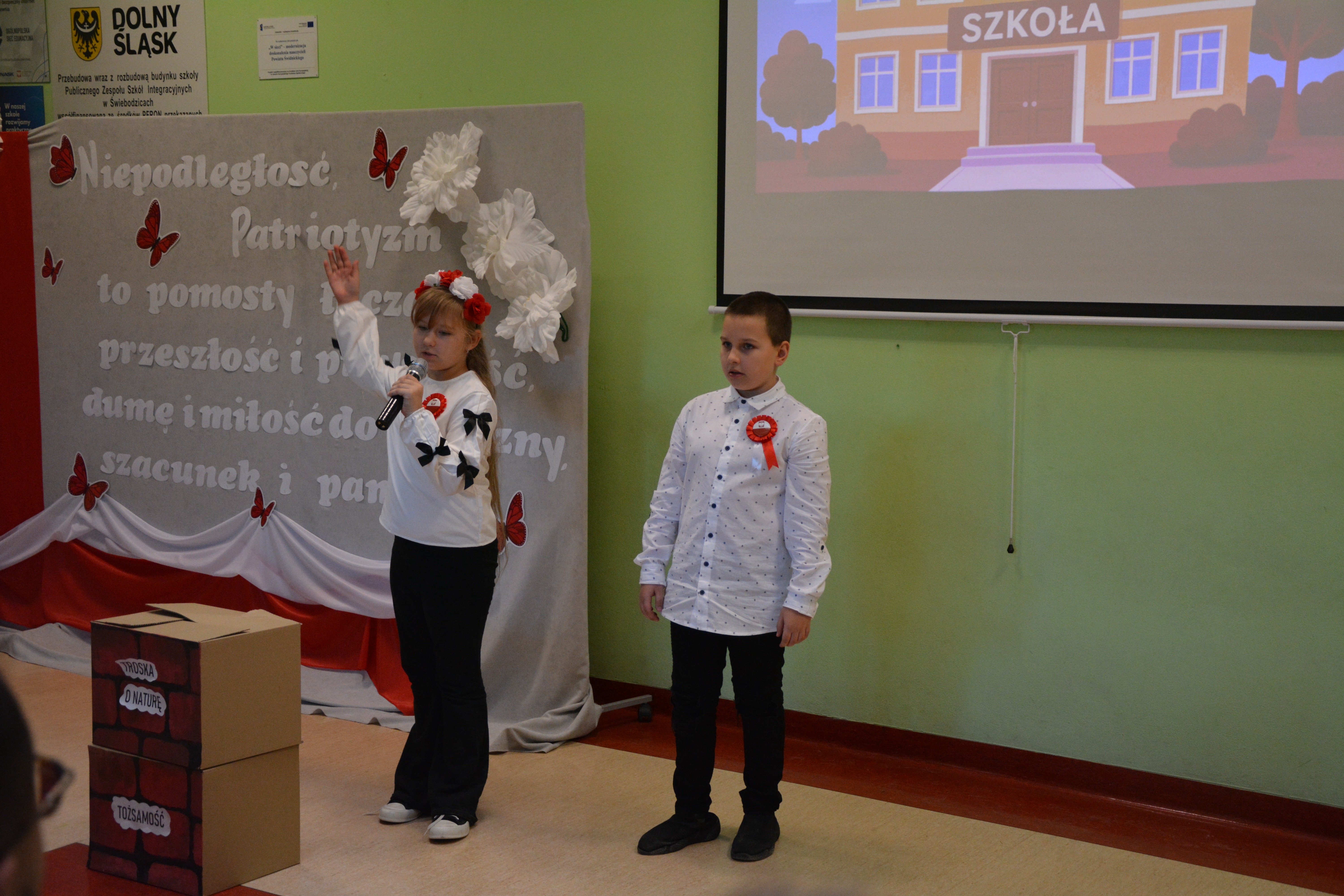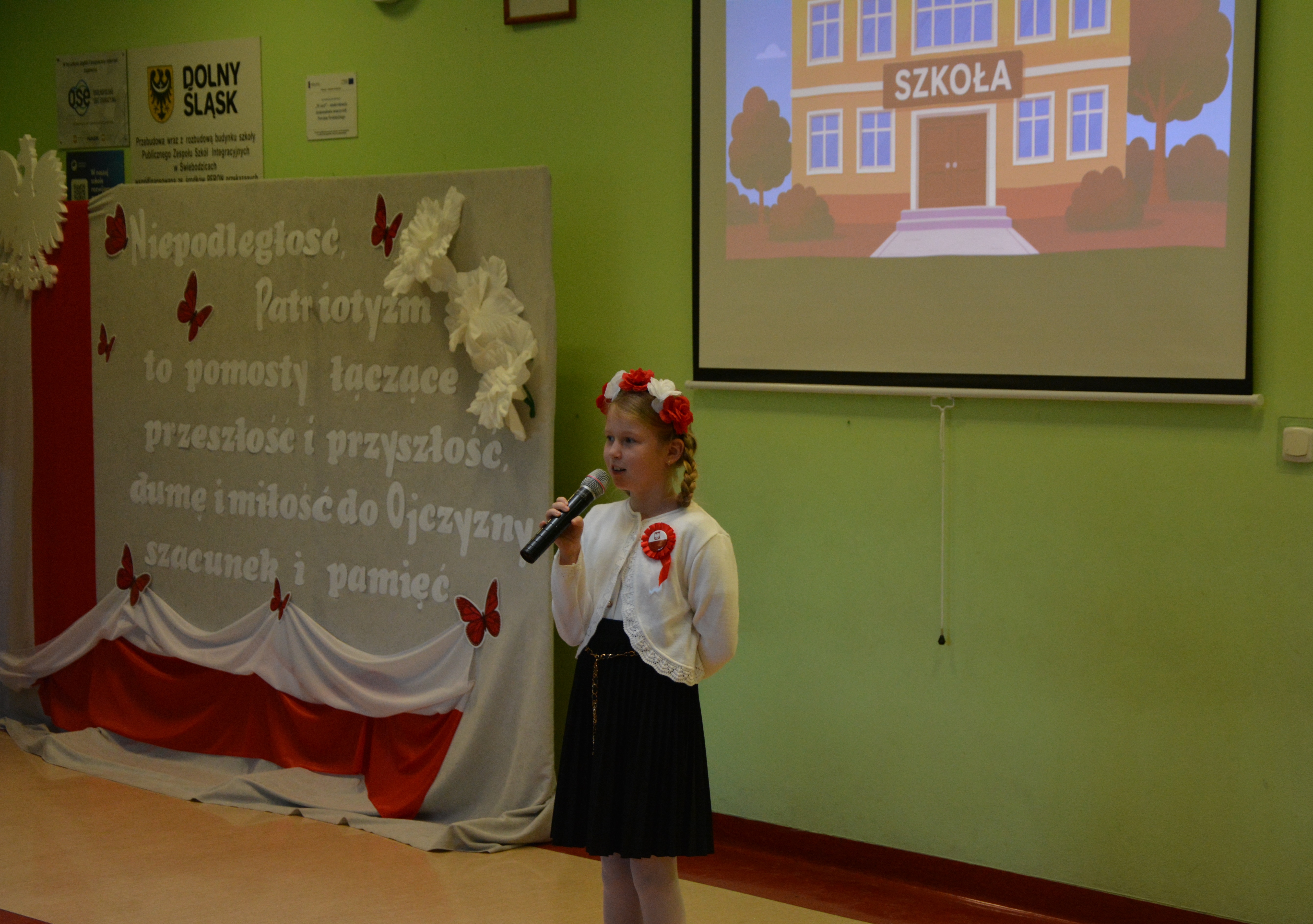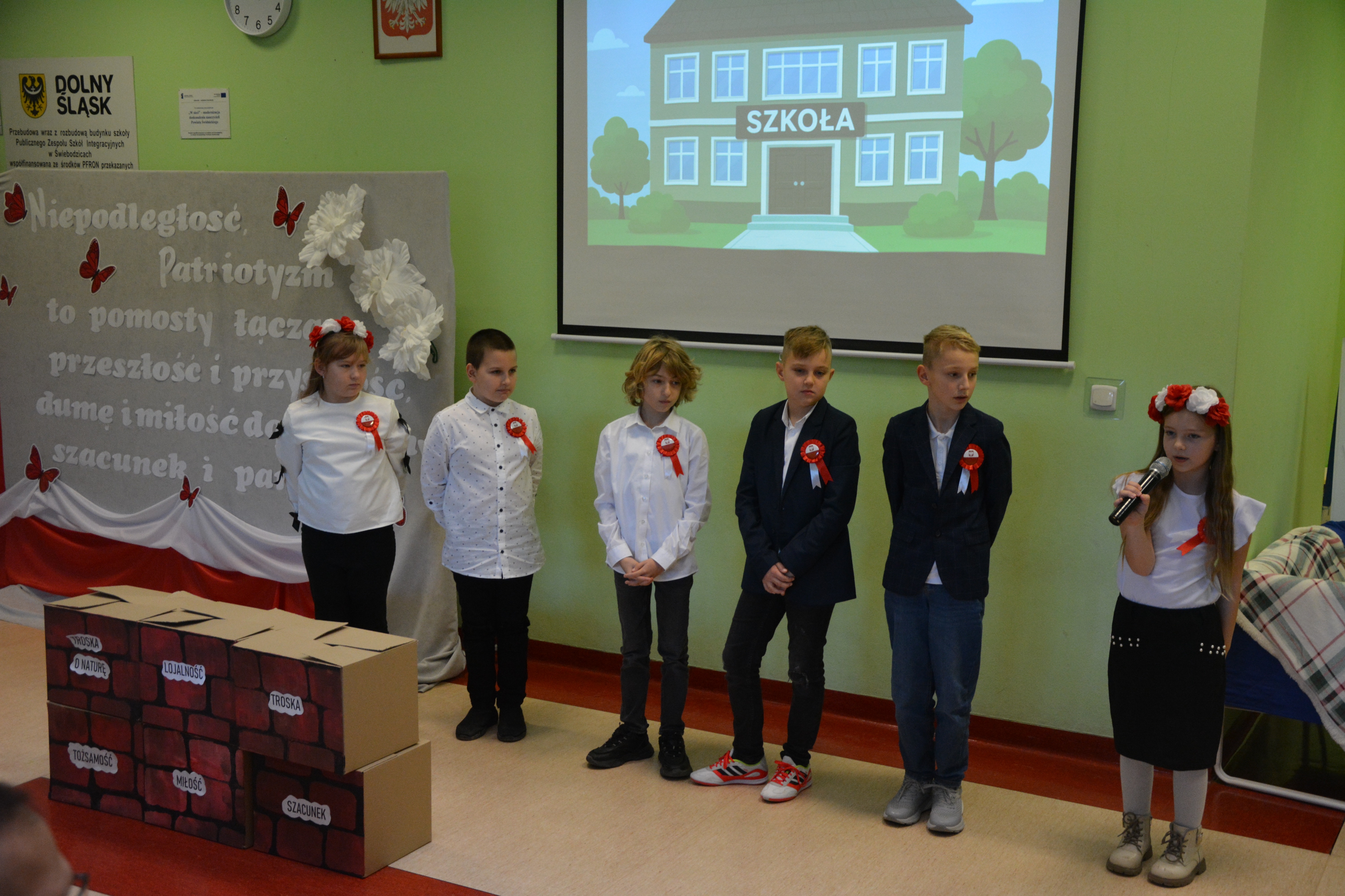 W części artystycznej, która przybrała formę teatralno- wokalno- happeningową, uczniowie klasy trzeciej omówili po krótce najważniejsze daty związane z dążeniem Polaków do odzyskania niepodległości, a następnie opowiedzieli w formie happeningu o jedenastu wartościach, które powinien w sercu nosić każdy Polak. Postawili symboliczny mur, którego powinniśmy bronić każdego dnia. Nie zabrakło wzruszenia przy występach wokalnych uczennic z klasy trzeciej.